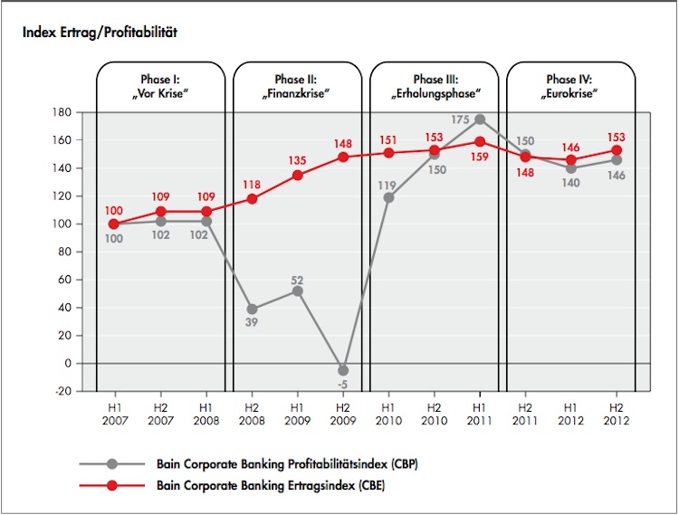 Im Firmenkundengeschäft trotzen die Banken der anhaltenden Eurokrise und der verschärften Regulierung, so der Corporate-Banking-Index der Managementberatung Bain & Company. Demnach erwirtschaften die Banken höhere Erträge und Gewinne als vor Ausbruch der Finanzkrise.