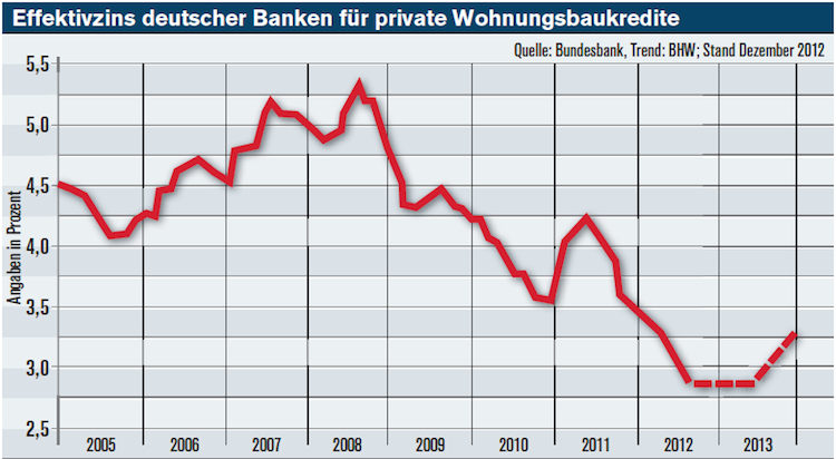 „Für die Baufinanzierungsberatung bedeutet dies, mit den Kunden schon im Vorfeld die Machbarkeit zu prüfen und Finanzierungsszenarien zu berechnen, sodass sie gerüstet sind und im richtigen Moment auch zuschlagen können“, sagt Dirk Günther, Geschäftsführer der Interhyp-Tochter Prohyp. Genauso wichtig aber sei es, die Risiken aktiv zu diskutieren und mögliche Sorgen zu analysieren. „Unabhängige Finanzierungsberater können sehr gut dabei helfen, den Kaufpreis einzuordnen“, so Günther. „Zins ist nicht alles“, gibt auch Robert Annabrunner, Fachbereichsleiter Drittvertrieb bei der Postbank-Marke DSL-Bank, zu bedenken. „Allerdings wird die Nachfrage durch die niedrigen Zinsen noch zusätzlich befeuert, weil die Renditen, die man derzeit mit Immobilien erzielen kann, vergleichsweise hoch sind. Diese Effekte führen dazu, dass werthaltige Immobilien weiter gefragt sind und damit auch die Preise beflügelt werden.“ Für Bauwillige stellt sich naturgemäß die Frage, wohin sich das Zinsniveau entwickeln wird. Seit dem Zwischentief Anfang Juni 2012 hat sich Baugeld bereits leicht verteuert.