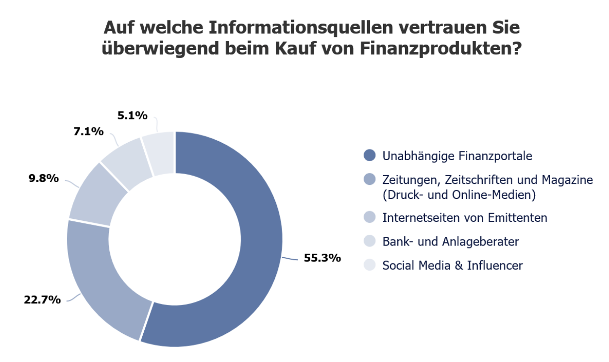 Wie bereits im Vorjahr vertraut mehr als die Hälfte der Anleger größtenteils auf unabhängige Finanzportale (55,3 Prozent), rund ein Viertel setzt auf Beiträge von Fachjournalisten in Zeitungen, Zeitschriften und Magazinen (Druck- und Online-Medien, 22,7 Prozent). Außerdem werden Internetseiten der Emittenten (9,8 Prozent), Bank- und Anlageberater (7,1 Prozent), sowie Social Media und Influencer (5,1 Prozent) herangezogen. Das ergab die Online-Umfrage Trend des Monats im April des Bundesverbands für strukturierte Wertpapiere (BSW), in der Anleger nach den Informationsquellen befragt wurden, auf die sie beim Kauf von Finanzprodukten überwiegend vertrauen.