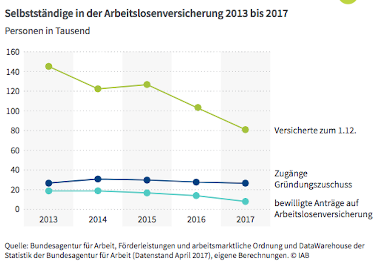 Selbstständige können als freiwillige Beitragszahler der Arbeitslosenversicherung beitreten. Seit 2013 ist die Zahl dieses Personenkreises um mehr als 40 Prozent gesunken. Konkret bedeutet dies, dass jeder Zweite die Absicherung kündigt. Insgesamt sinkt die Anzahl freiwilliger Beitragszahler von ursprünglich 145.000 Personen auf 81.000 Personen. Zugleich stellt auch nur jeder zweite Existenzgründer den Antrag auf Beitritt zur Versicherung. Von ursprünglich 19.000 Anträgen ist die Zahl auf etwa 9.500 Anträge pro Jahr geschrumpft. Alle Zahlen stammen aus der Studie des Instituts für Arbeitsmarkt- und Berufsforschung (IAB).