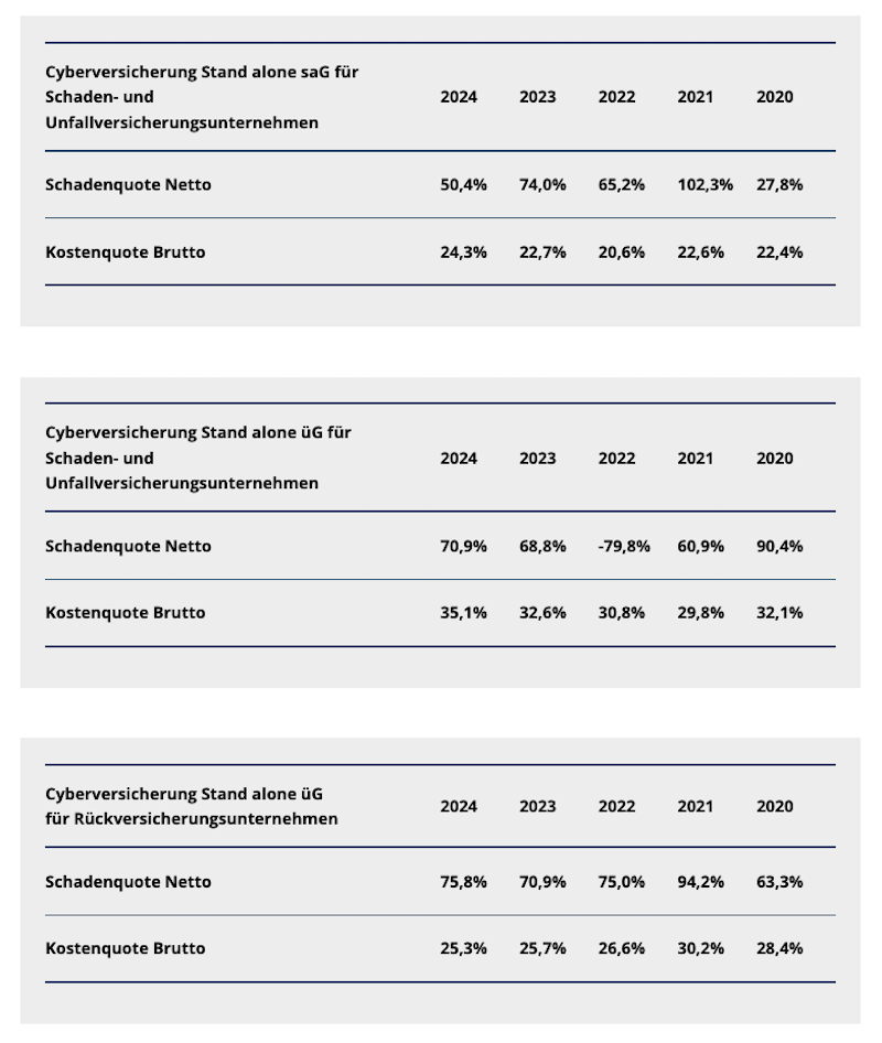 Zugleich hat die BaFin Cyberdaten aus Branchenabfragen für die Jahre 2020 bis 2024 veröffentlicht: Im selbst abgeschlossenen Geschäft der Schaden- und Unfallversicherer lag die Netto-Schadenquote 2024 bei 50,4 Prozent nach 74,0 Prozent im Vorjahr. Die Brutto-Kostenquote erreichte 24,3 Prozent.