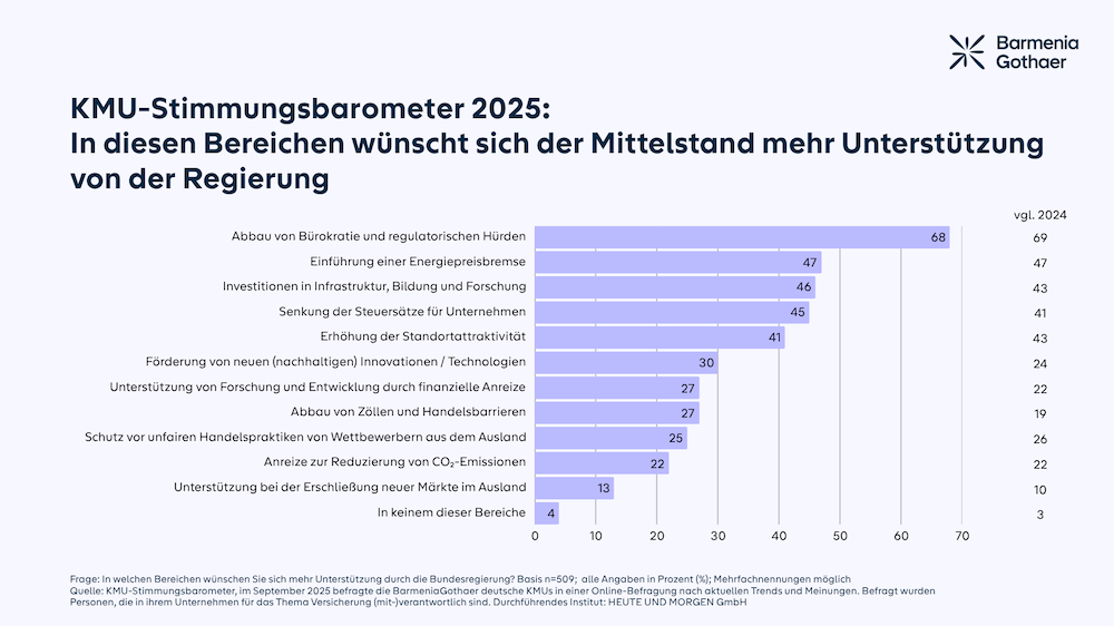 Die Bundesregierung unter Kanzler Friedrich Merz hat sich ehrgeizige Ziele gesetzt, um den Mittelstand zu stärken – von Investitionsprogrammen über Steuerreformen bis zur Modernisierungsagenda. Wie die Politik bislang ankommt, zeigt das aktuelle KMU-Stimmungsbarometer der BarmeniaGothaer: Rund 26 Prozent der befragten kleinen und mittleren Unternehmen sind mit der Arbeit der Regierung (eher) zufrieden. Das entspricht einem Zuwachs von sieben Prozentpunkten im Vergleich zum Vorjahr.