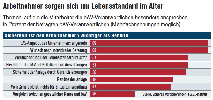 Menschen von der Notwendigkeit einer privaten Altersvorsorge zu überzeugen, war noch nie ein leichtes Unterfangen. Glaubt man den Einschätzungen diverser Meinungsforscher, dürfte der Schwierigkeitsgrad dieser Aufgabe weiter zugenommen haben: „Öffentliche Debatten und kritische Medienberichte über die demografische Entwicklung sowie über die Rentabilität von gesetzlicher Rente und kapitalgedeckter Altersvorsorge verunsichern viele Menschen“, heißt es geradezu exemplarisch in einer aktuellen Studie zur betrieblichen Altersversorgung (bAV), die die Generali Versicherungen und das F.A.Z.-Institut veröffentlicht haben.