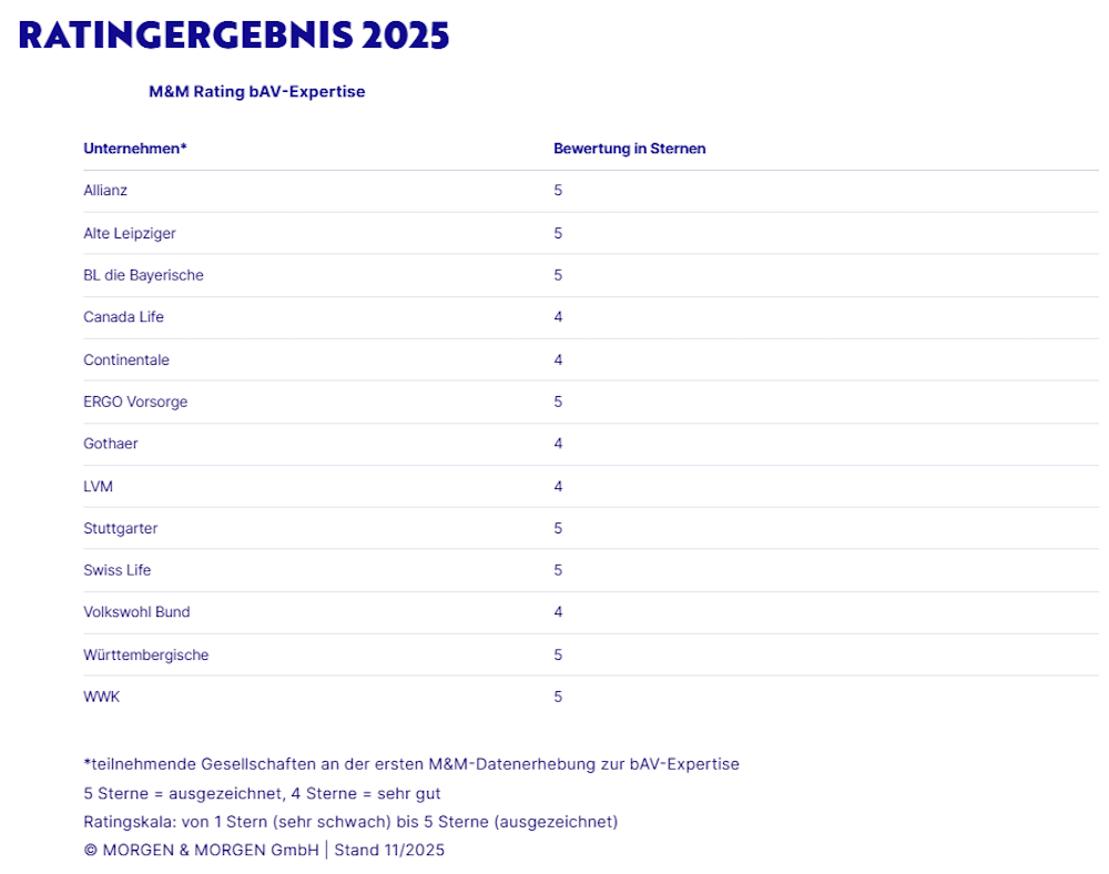 Morgen & Morgen hat erstmals ein Rating zur Expertise der Versicherer in der betrieblichen Altersvorsorge veröffentlicht. Die Analyse basiert auf einer umfangreichen Datenerhebung und bewertet die fachliche, technische und prozessuale Leistungsfähigkeit der Anbieter. Hintergrund ist die wachsende Bedeutung der bAV: Demografie, Fachkräftemangel und regulatorische Anforderungen erhöhen den Druck auf Unternehmen, zuverlässige Versorgungskonzepte zu bieten – und auf Versicherer, ihre Kompetenz klar nachzuweisen.