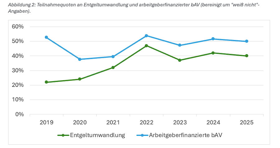 Die Entgeltumwandlung stellt in der Praxis keine Alternative zur arbeitgeberfinanzierten betrieblichen Altersversorgung dar, sondern ergänzt diese. Das zeigt sich daran, dass 89 Prozent der Arbeitnehmenden, die eine Entgeltumwandlung nutzen, gleichzeitig auch über eine vom Arbeitgeber finanzierte bAV verfügen. Aufgrund dieser hohen Kombinationsquote bleibt die Versorgungslücke groß: Seit Jahren verfügt ein erheblicher Anteil der Arbeitnehmenden über keinerlei Ansprüche aus der betrieblichen Altersversorgung – mehr als 40 Prozent sind davon betroffen. Bemerkenswert ist dabei, dass der genaue Anteil nicht exakt beziffert werden kann, da rund sechs Prozent der Befragten gar nicht wissen, ob sie überhaupt einen Anspruch auf eine bAV haben.