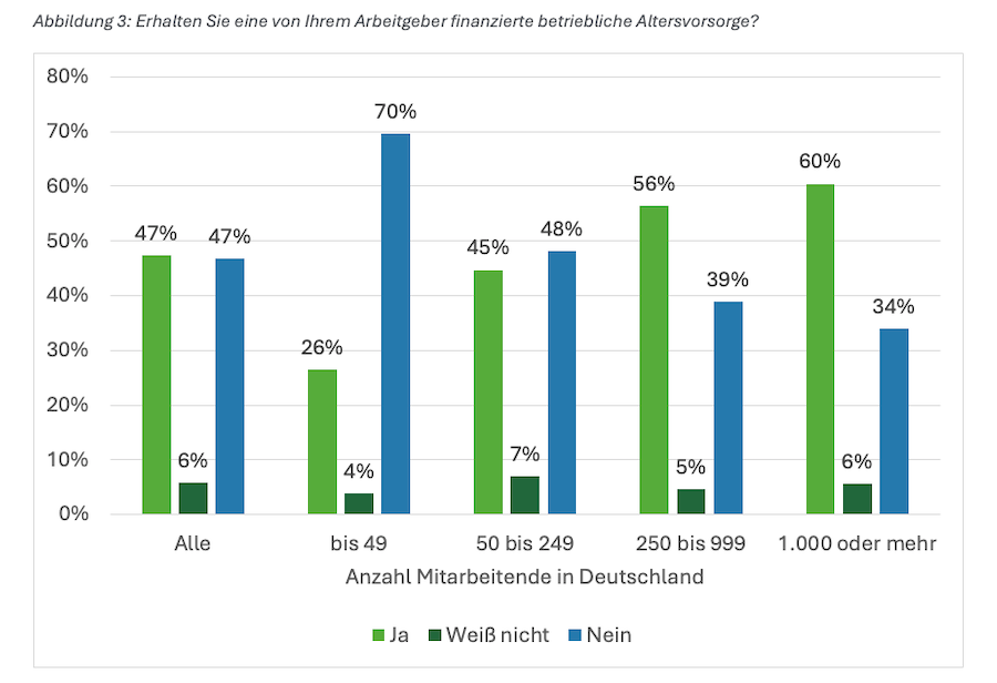 Arbeitgeberfinanzierte Angebote an bAV sind für Unternehmen in erster Linie mit Aufwand und Kosten verbunden. Zudem gibt es keine gesetzliche Verpflichtung, arbeitgeberfinanzierte bAV anzubieten, zumindest nicht über den Arbeitgeberzuschuss von 15 Prozent hinaus, der seit 2019 durch das Betriebsrentenstärkungsgesetz geregelt wird. Je kleiner ein Betrieb ist, desto kleiner ist auch der Personalbereich und desto geringer sind vorhandene Ressourcen, das Thema bAV zu implementieren und zu verwalten. Dies geht deutlich aus unserer Befragung hervor: Bei Unternehmen mit 1.000 oder mehr Mitarbeitenden in Deutschland beträgt der Anteil derjenigen, die arbeitgeberfinanzierte bAV anbieten, 60 Prozent. Bei Unternehmen mit weniger als 50 Mitarbeitenden liegt er bei nur 26 Prozent. Auch unter der Annahme, dass der Nutzen von bAV für kleine Unternehmen erkennbar ist, ist die Aufwand-Nutzen-Relation deutlich ungünstiger als in großen Unternehmen.