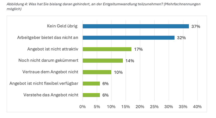 Deutlich vielschichtiger sind vermutlich die Gründe, die Arbeitnehmende daran hindern, an der Entgeltumwandlung teilzunehmen. Da sie mehrheitlich selbst von ihrem Bedarf überzeugt sind und zudem seit 2019 Anspruch auf einen Zuschuss des Arbeitgebers haben, ist schwer zu verstehen, warum die Teilnahmequoten nicht höher sind oder zumindest kontinuierlich steigen. Werden die Arbeitnehmenden selbst gefragt, nennen sie vor allem zwei Gründe: 32 Prozent der Befragten geben an, ihr Arbeitgeber biete keine Entgeltumwandlung an (obwohl die Arbeitnehmer einen Rechtsanspruch darauf haben). Ganze 37 Prozent geben an, sie hätten kein Geld übrig.