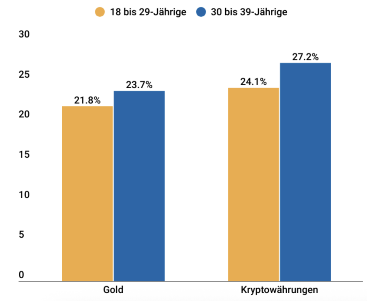 Die Daten zeigen deutliche Unterschiede zwischen den Altersgruppen. Anleger unter 30 Jahren investieren häufiger in Kryptowährungen als in Gold. Auch in der Altersgruppe der 30- bis 39-Jährigen dominiert zunehmend das digitale Asset. Erst ab etwa 50 Jahren kehrt sich das Verhältnis um: Hier bevorzugen Anleger wieder traditionelle Edelmetalle wie Gold und Silber. Die Erhebung verdeutlicht damit, dass sich ein Generationswechsel im Anlageverhalten abzeichnet – weg vom physischen Metall, hin zu digitalen Wertspeichern.