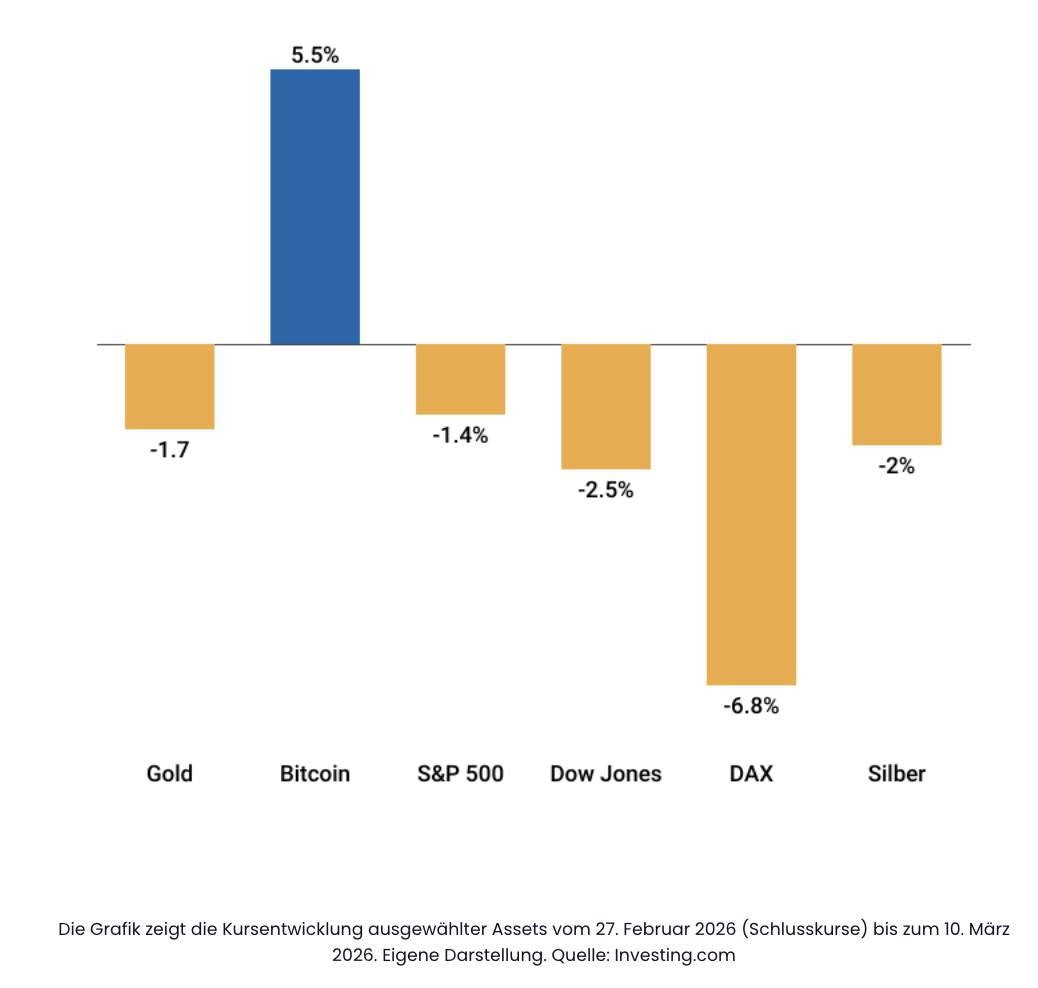Zehn Tage nach den US-israelischen Angriffen auf Iran zeigt sich ein ungewöhnliches Bild an den Finanzmärkten. Während viele klassische Anlageklassen unter geopolitischer Unsicherheit leiden, hat sich ausgerechnet Bitcoin als stärkster Performer erwiesen.