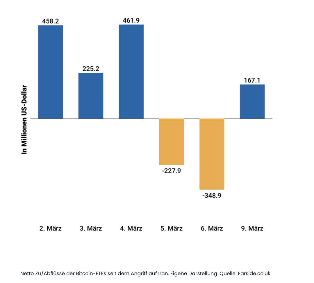 Hinzu kommen messbare Kapitalströme. Seit dem ersten Handelstag nach Beginn der Eskalation verzeichnen US-Spot-Bitcoin-ETFs netto Zuflüsse von insgesamt 735,6 Millionen Dollar.