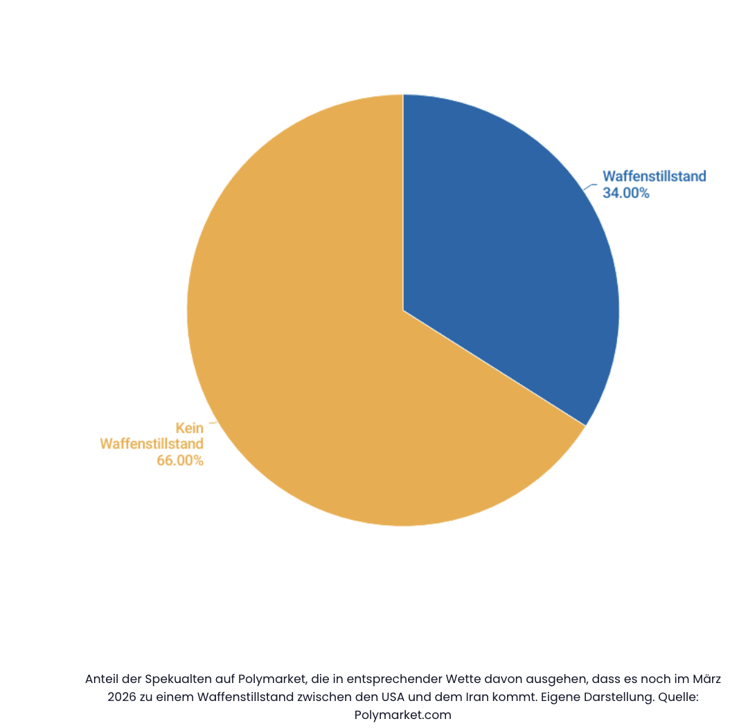 Auch Prognosemärkte spiegeln diese Erwartungen wider. Auf der Plattform Polymarket bewerten Nutzer die Wahrscheinlichkeit eines Waffenstillstands zwischen den USA und Iran noch im März aktuell mit rund 34 Prozent. Das Wettvolumen liegt bei etwa 4,8 Millionen Dollar.