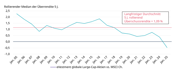 In den letzten fünf Jahren haben sich die Chancen für aktive Manager in globalen Aktienmärkten durchweg verschlechtert. In diesem Zeitraum sind die erzielten Überrenditen unter ihre längerfristigen Durchschnittswerte gefallen. Im jüngsten Zeitraum ist es sogar zum ersten Mal in der 20-jährigen Geschichte der Vergleichsgruppe globaler Large-Cap-Aktienmanager vorgekommen, dass der durchschnittliche Manager über einen rollierenden Fünfjahreszeitraum keine positiven Überschussrenditen (vor Abzug von Gebühren) erzielen konnte.