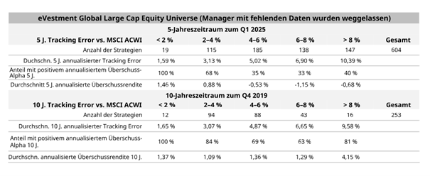 Im Bereich globaler Aktien konnten aktive Manager in der Vergangenheit (im Durchschnitt) einen Mehrwert erzielen, indem sie ein höheres aktives Risiko (auch Tracking Error genannt) eingegangen sind. Doch welches Maß an aktivem Risiko ist erforderlich, um solche Resultate nachhaltig zu erreichen?