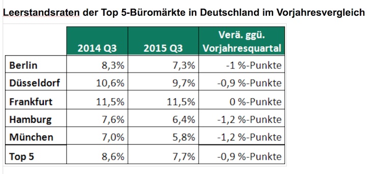 In den deutschen Städten Berlin, Düsseldorf, Frankfurt, Hamburg und München sind die Leerstandsraten im Durchschnitt um 0,9 Prozent im Vorjahresvergleich gesunken. Lediglich in Frankfurt stagnierte der Leerstand bei 11,5 Prozent. Durch die hohe Flächennachfrage in Berlin sank die Leerstandsrate im dritten Quartal auf ein neues Allzeittief von nunmehr 7,3 Prozent und verringerte sich somit im Vorjahresvergleich um einen Prozentpunkt.