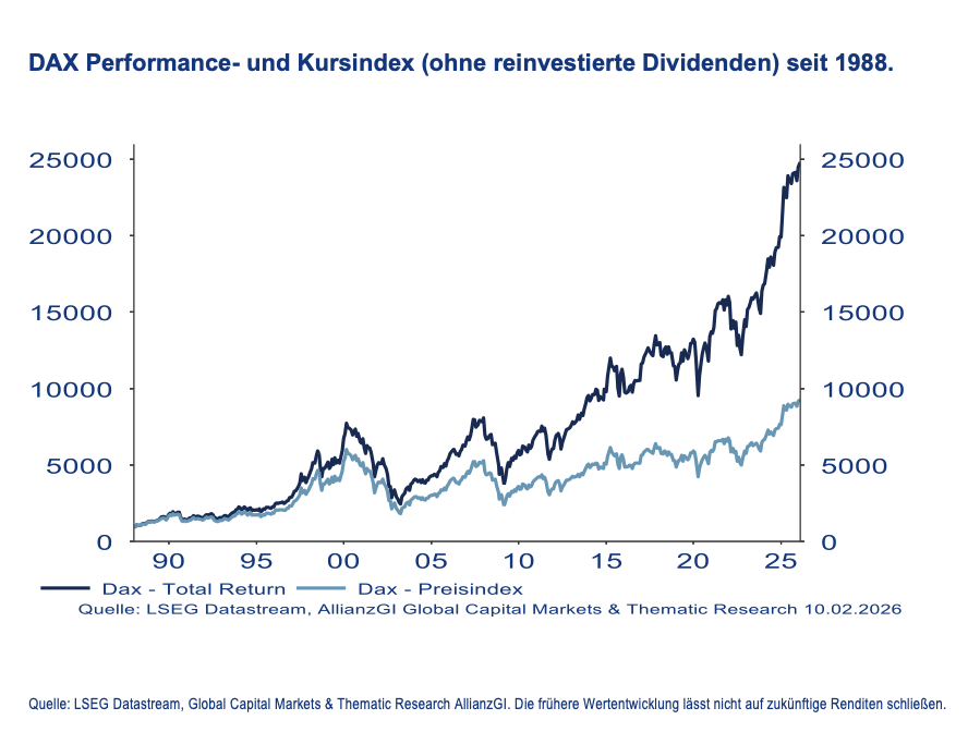 Das wäre zwar immer noch eine Verzehnfachung seit seinem Indexstart Anfang 1988, aber deutlich unter dem DAX, den wir so kennen. Der Grund: Beim DAX 40 handelt sich um einen sogenannten Performanceindex, der – anders als ein Preis- oder auch Kursindex – die Dividenden reinvestiert. Das heißt, bei der Indexkonstruktion wird die Annahme zugrunde gelegt, dass die Anleger die an sie ausgeschütteten Dividenden jedes Mal wieder vollständig im Unternehmen anlegen.