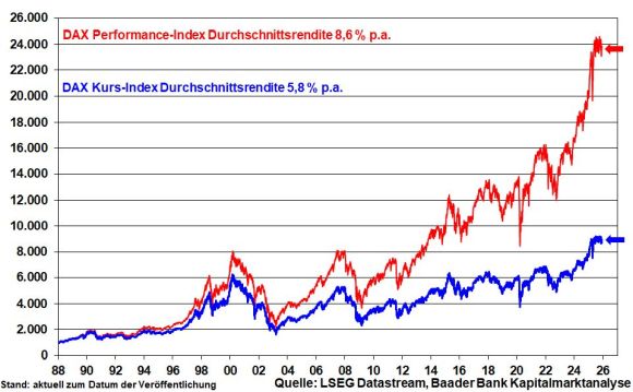 2026 wird wieder ein grundsätzlich guter Dividendenjahrgang, selbst wenn es in der Autobranche zu Kürzungen kommt. So setzen große Kapitalsammelstellen und Pensionskassen Unternehmen unter Druck, möglichst ausschüttungsstark zu bleiben. Vergleicht man die Renditen des reinen Kurs-DAX mit dem bekannteren Performance-DAX, der Ausschüttungen einrechnet und Wiederanlage unterstellt, erkennt man die langfristig hohe Attraktivität des Dividendeneffekts als Zinseszinseffekt.