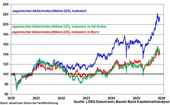 Für japanische Aktien sprechen neben soliden Bilanzen und stabilen Gewinnerwartungen die zunehmend fruchtenden Reformen bei der Unternehmensführung, die zu einer verbesserten Transparenz, Wettbewerbsfähigkeit und einem optimierten Einsatz von Finanzmitteln beitragen. Zudem bleibt die BoJ der beste Freund des japanischen Finanzministers, dessen angekündigtes Konjunkturpaket über umgerechnet 117 Mrd. Euro sie finanziert. Deutliche Renditeerhöhungen bei Staatsanleihen haben da keinen Platz, da sie (finanz-)wirtschaftlich kontraproduktiv wirken. Allenfalls wird die BoJ eine sanft restriktive Geldpolitik durchführen können, um den Yen nur behutsam steigen zu lassen, da Japan eine Exportnation ist. Damit verliert das Thema Währungsverlust bei japanischen Aktien für Euro- und Dollaranleger an Bedeutung.