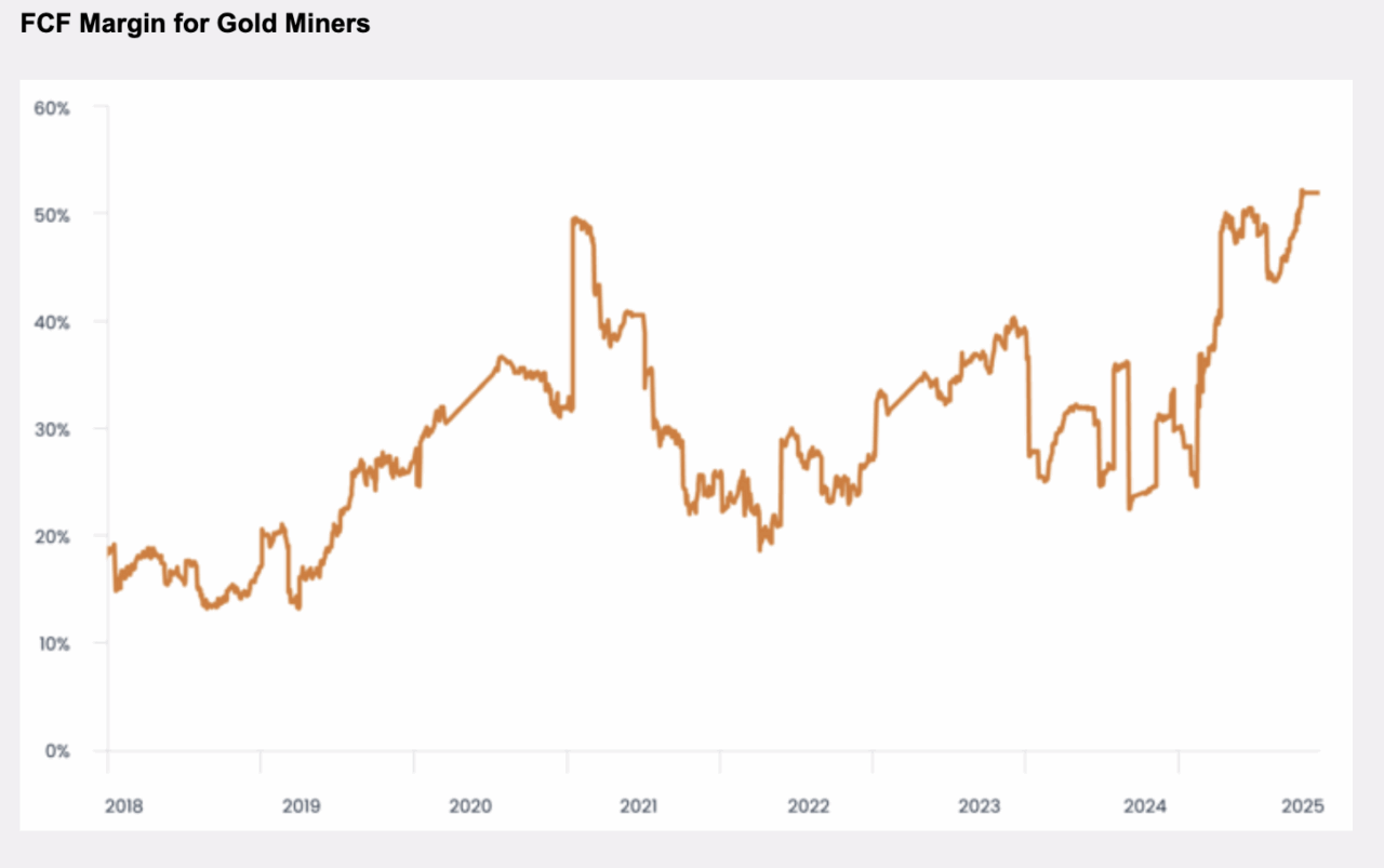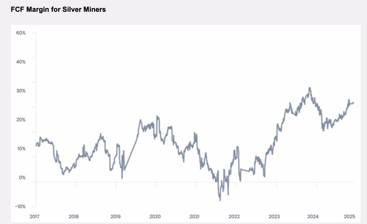 Das unserer Ansicht nach geringe Interesse an Währungsmetallen zeigt sich auch in der Bewertung von Gold- und Silberminenunternehmen im Verhältnis zu den von ihnen generierten Cashflows. Die folgenden Abbildungen zeigen, dass die Cash-Margen erheblich steigen, was zum Teil auf den Wertanstieg der von diesen Unternehmen geförderten Metalle zurückzuführen ist.
