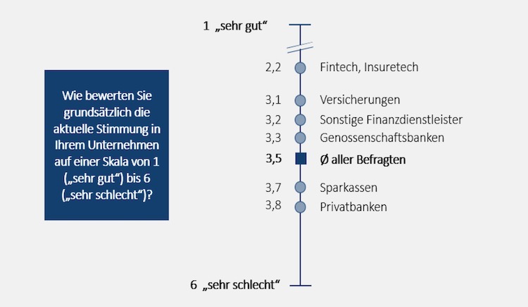 Fintechs und Insurtechs bewerten die Stimmung in ihren Unternehmen hingegen mit einer Durchschnittsnote von 2,2 deutlich positiver. Die Grundstimmung bei den klassischen Branchenvertretern kann aber bestenfalls als „verhalten“ angesehen werden.