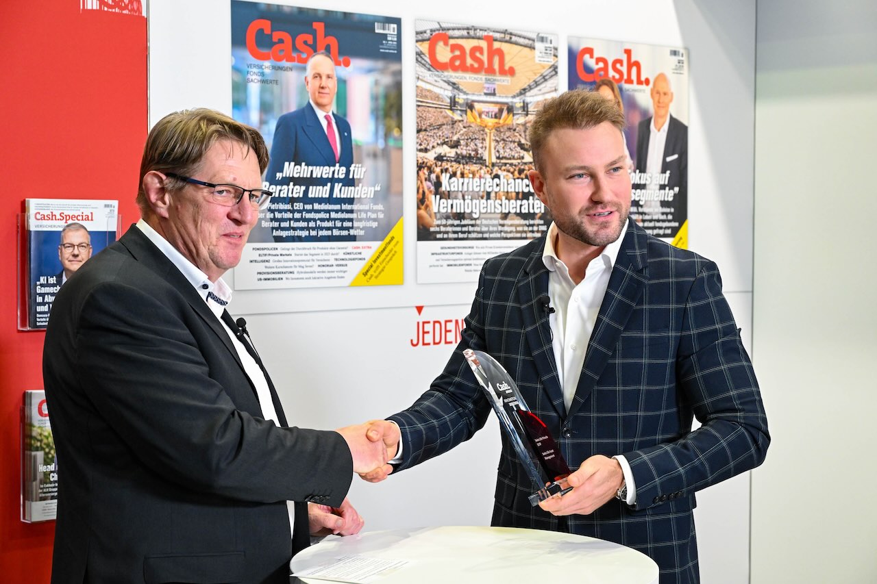 Im Bereich Investmentfonds ging der Preis an Swiss Life Asset Management. Ausgezeichnet wurde der Swiss Life Privado ELTIF. Ziel des Fonds ist es, Anlegern langfristige Beteiligung an nicht-börsennotierten Infrastrukturanlagen bzw. Infrastrukturunternehmen in OECD-Ländern zu ermöglichen. Typische Bereiche dabei sind erneuerbare Energien, Versorgungsinfrastruktur, Kommunikation/Glasfaser, Transport/Verkehr, soziale Infrastruktur (zum Beispiel Krankenhäuser, Schulen) et cetara. Tristan Schirra, Head Fund Management bei Swiss Life Asset Managers, nimmt den Preis von Cash.-Redakteur Stefan Löwer entgegen. Schirra betonte, dass die Investitionen über die mehr als zwölf Milliarden Euro schwere Infrastruktur-Investmentplattform der Swiss Life vorgenommen werden und bei jeder Investition auch die Swiss Life Versicherung selbst beteiligt ist.