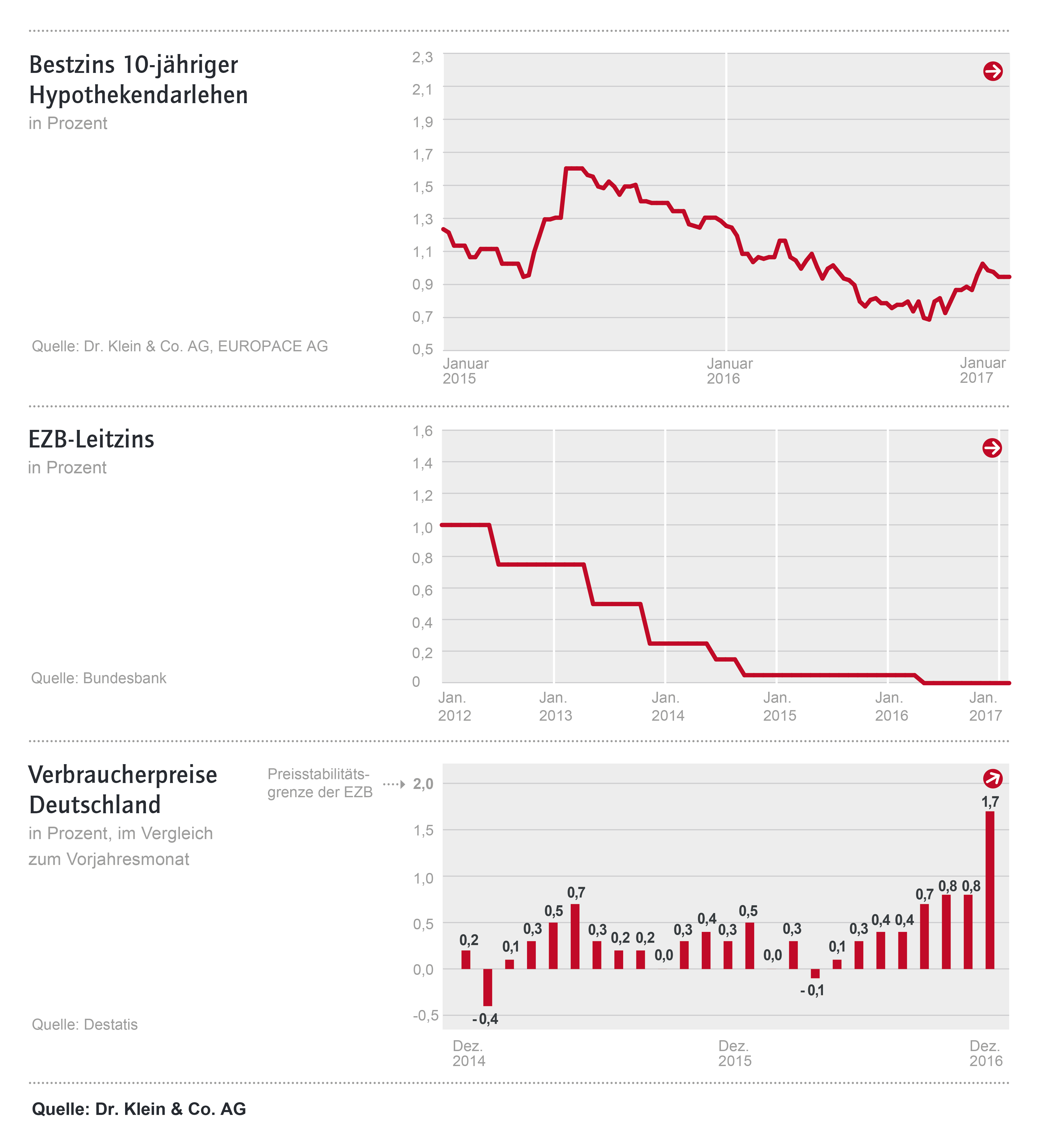 Das Zinsniveau sei jedoch weiterhin niedrig, liege sogar etwas unter dem Januarwert von 2016 und ermögliche somit weiterhin ein attraktives Umfeld für Baufinanzierungen. „Gerade Kunden, die ihre Anschlussfinanzierung planen, finden 2017 sehr attraktive Konditionen vor. Wir beobachten gerade in diesem Segment einen Anstieg der Immobilienfinanzierungen“, sagt Michael Neumann, Vorstand der Dr. Klein & Co. AG.
