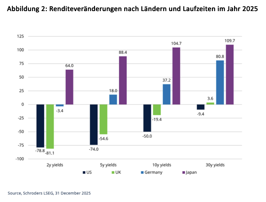 Eines der prägenden Merkmale des aktuellen Umfelds ist die Divergenz zwischen den Ländern und an verschiedenen Punkten der Zinskurve. Betrachtet man die Bewegungen an den wichtigsten Zinsmärkten im Jahr 2025, zeigen sich sehr unterschiedliche Entwicklungen: Die Renditen am langen Ende stiegen in Deutschland und Japan, weil fiskalische Stimulierungsmaßnahmen die Anleihekurse belasteten. In den USA und im Vereinigten Königreich hingegen war die Entwicklung eher durch nachlassenden Inflationsdruck und eine schwächere Arbeitsmarktdynamik geprägt, wobei kürzere Laufzeiten fielen, als weitere geldpolitische Lockerungen eingepreist wurden.