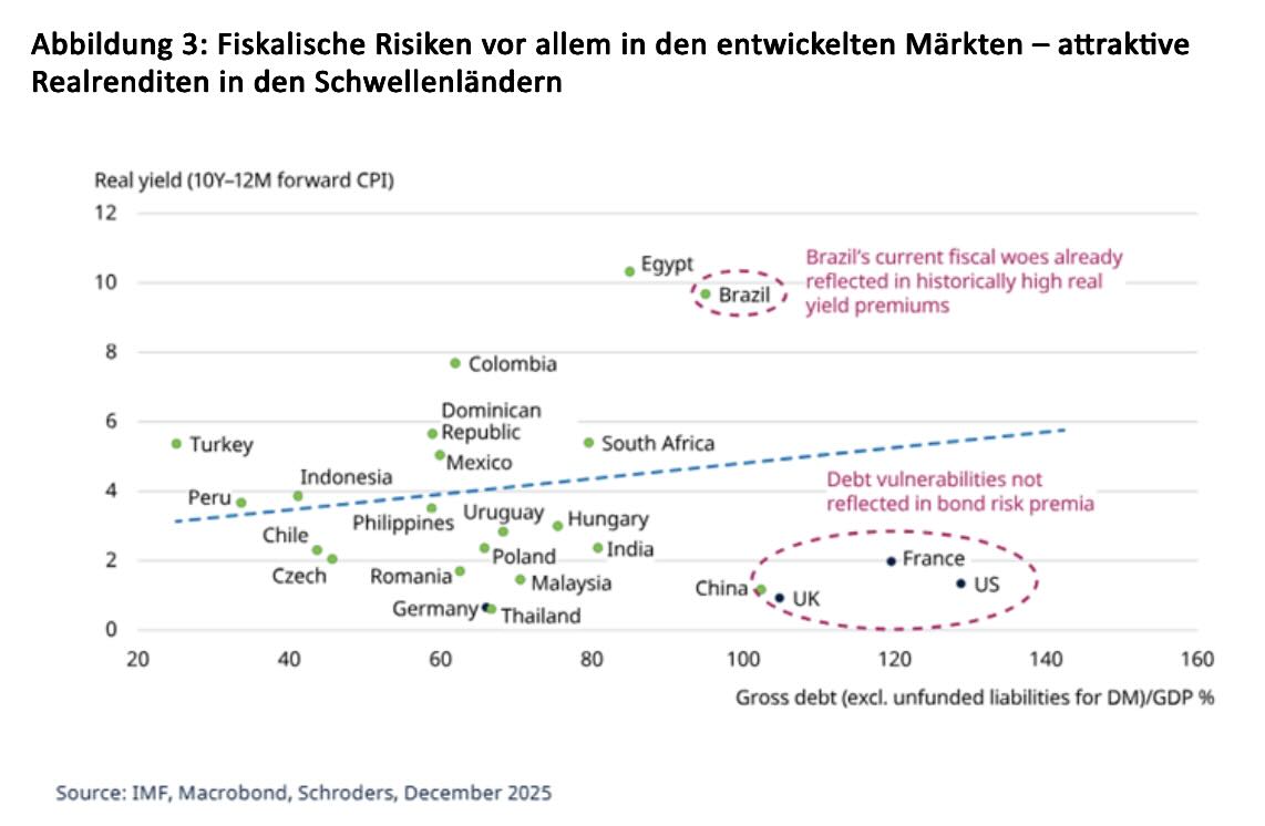 Obwohl Schwellenländer gemeinhin als riskanter gelten, sind es tatsächlich die entwickelten Volkswirtschaften, in denen sich fiskalische Risiken zunehmend konzentrieren. Betrachtet man das Verhältnis von Staatsverschuldung zu BIP im Vergleich zur Realrendite, werden Anleger für das Halten von Schwellenländeranleihen gut entschädigt – deutlich besser als in der entwickelten Welt, wo die Verschuldung hoch und die Realrenditen vergleichsweise niedrig sind.