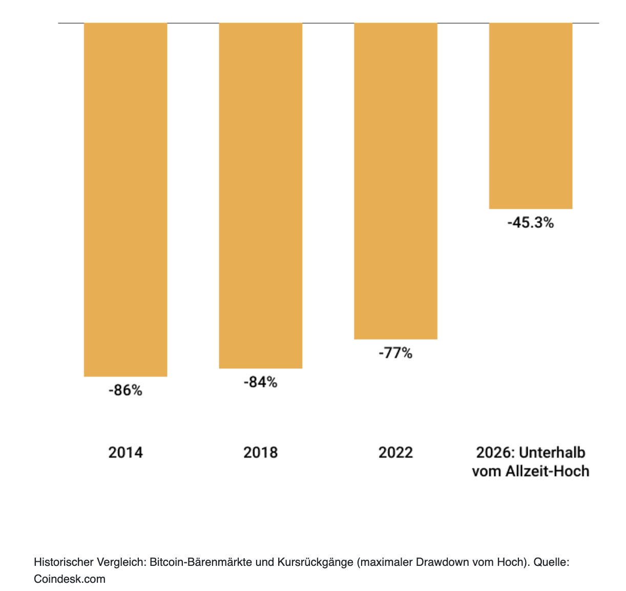 Gleichzeitig zeigt die Infografik, dass ein Rückgang um rund 85 Prozent historisch nicht ausgeschlossen ist. Frühere Bärenmärkte waren teils von ähnlich starken Kursverlusten geprägt. Im Jahr 2014 fiel Bitcoin vom Hoch aus um etwa 86 Prozent, 2022 lag der maximale Rückgang bei rund 77 Prozent. Aktuell notiert der Kurs bereits mehr als 45 Prozent unter seinem Allzeithoch. Die historische Erfahrung zeigt, dass selbst nach deutlichen Korrekturen weitere Abwärtsbewegungen möglich sind.