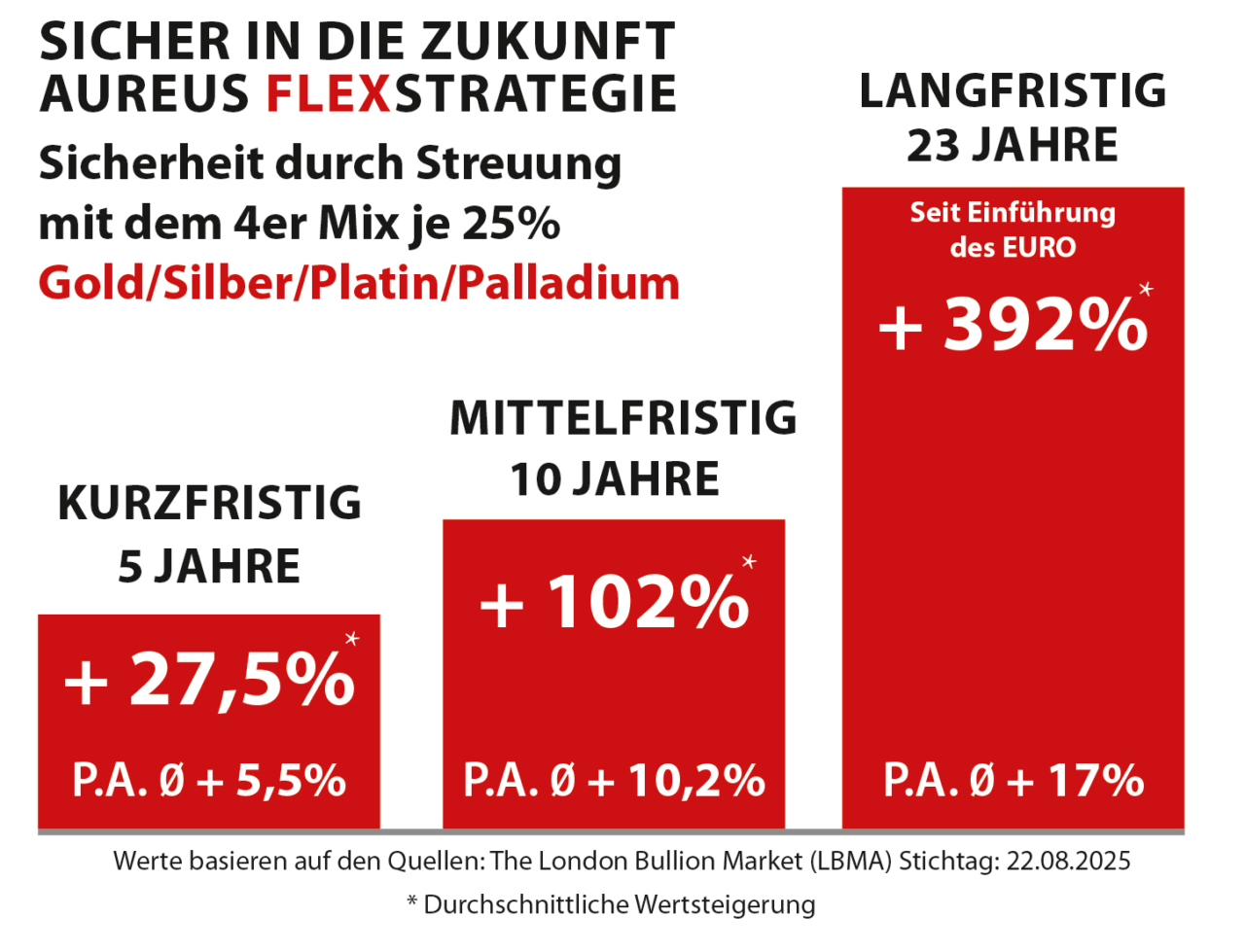 Neumann: Wir verfügen über langjährige Erfahrung und eine ausgezeichnete Marktexpertise in allen Fragen rund um das Gold Investment speziell auch über Silber, Platin und Palladium. Wir bieten unseren Kunden ein umfangreiches Sicherheitskonzept. Mit unserem Sparplan kann auch der Kleininvestor bereits ab 25 € monatlich in alle 4 Edelmetalle investieren. Einmalinvestitionen ab 2.500 € bis hin zum Großinvestor sind bei AUREUS zu Top-Konditionen möglich. Darüber hinaus kommen unsere Kunden in den Genuss von umfangreichen Serviceleistungen. Vor allem durch den Handel und die Einlagerung in unserem Zollfreilager Schweiz mit höchstem Sicherheitsansprüchen. Zusätzlich sparen die Anleger bei Silber, Platin, Palladium die deutsche MwSt. von derzeit 19%, was ein wichtiger Anlagevorteil ist. Eine Entwicklung der Rohstoffpreise ist von einer Reihe von Markteinflüssen geprägt. Daher empfehlen wir eine Mischung aus allen vier Edelmetallen, frei nach dem Motto „Wer streut, rutscht nicht aus“. Eine Anlage in alle 4 Edelmetalle hat sich kurz- / mittel- oder langfristig (siehe Schaubild) als lukrative Anlagestrategie erwiesen.