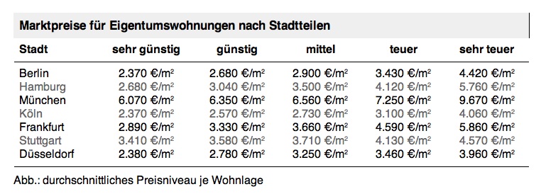 Derzeit müssten im Schnitt zwischen 3.250 Euro pro Quadratmeter in Düsseldorf und 6.850 Euro in München für den Kauf einer Eigentumswohnung eingeplant werden. Innerhalb der Metropolen würden je nach Standort der Immobilie allerdings oft enorme Preisunterschiede bestehen. Die Preisspanne zwischen sehr günstigen und sehr teuren Stadtteilen in den sogenannten A-Städten liege bei durchschnittlich 75 Prozent.