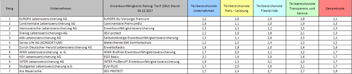In seinem ersten Rating der selbstständigen Erwerbsunfähigkeitsversicherungen hat das Institut für Vorsorge und Finanzplanung (IVFP) 15 Tarife von 15 Anbietern auf bis zu 90 Kriterien in vier Teilbereichen untersucht. Am besten schnitt dabei die Europa Lebensversicherung ab, gefolgt von Continentale, Hannoversche und Dialog.