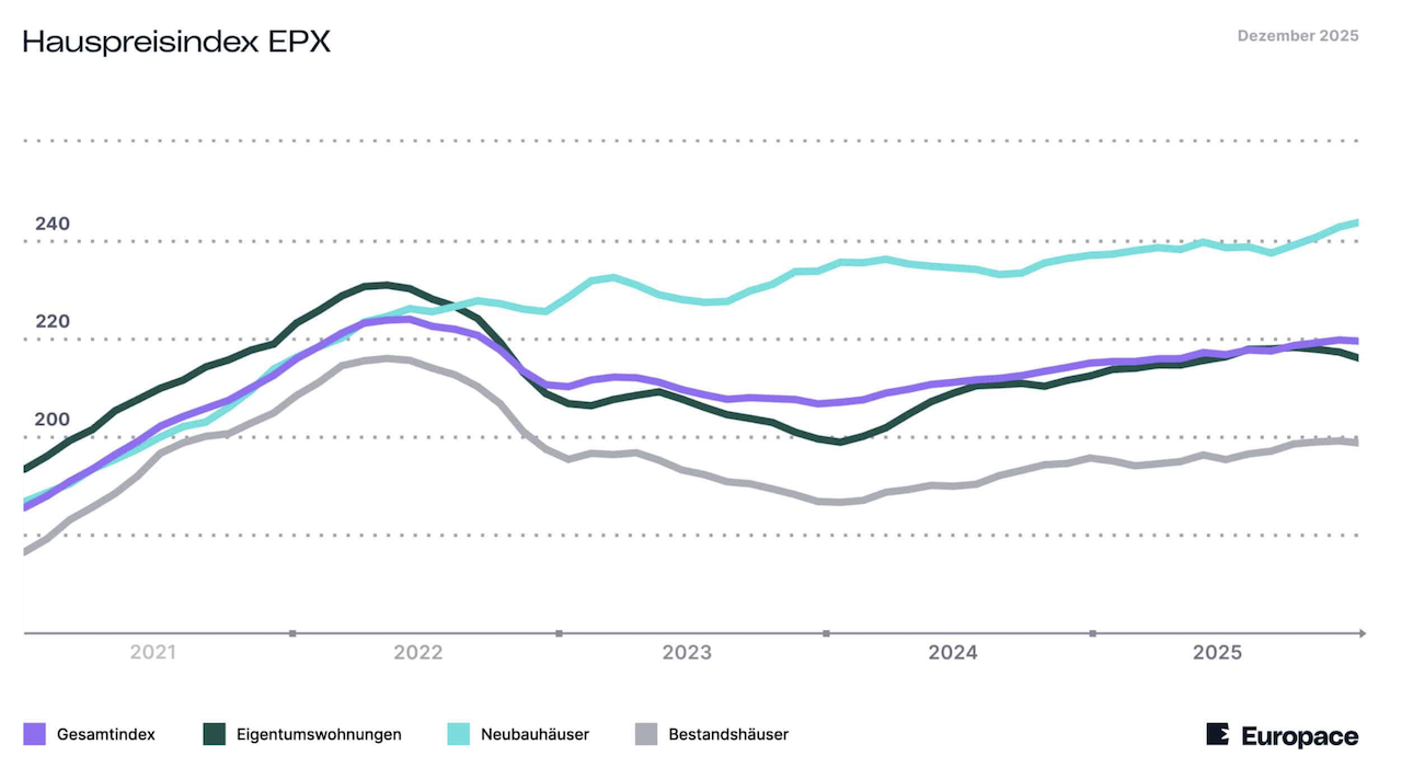 Der Europace Hauspreisindex verzeichnet im Dezember 2025 einen leichten Rückgang der Immobilienpreise in fast allen Segmenten. Besonders deutlich fällt die Entwicklung bei Eigentumswohnungen aus. Gleichzeitig setzen neue Ein- und Zweifamilienhäuser ihren Preisanstieg fort, allerdings mit geringerer Dynamik als im Vormonat.