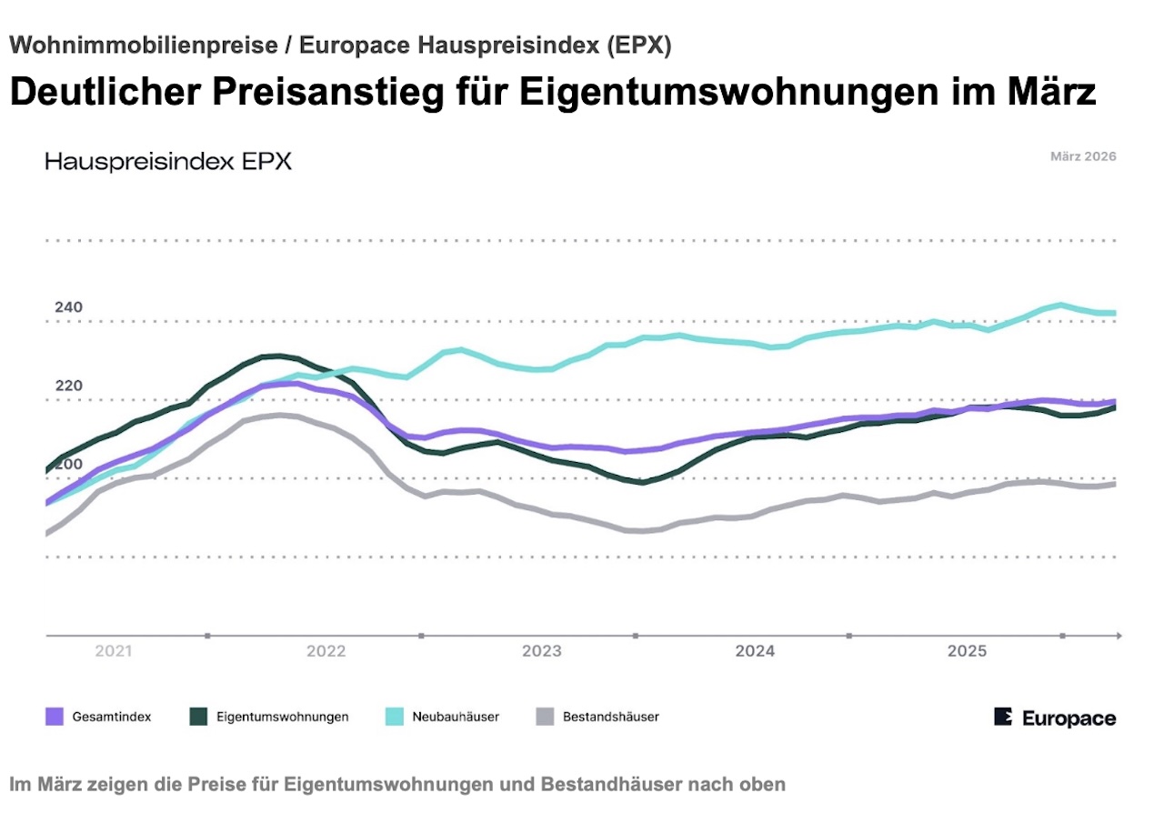 Europace Co-CEO und Vorstand Stefan Münter erklärt: „Nach einer Phase der Seitwärtsbewegung sehen wir im Europace Hauspreisindex wieder leichte Preissteigerungen – getragen vor allem von Eigentumswohnungen und dem Bestand. Der Neubau bleibt stabil, ohne im März spürbare Dynamik. Der Zinsanstiegs im März führt zu einem erhöhten Nachfragedruck und unterstützt die Entwicklung.“