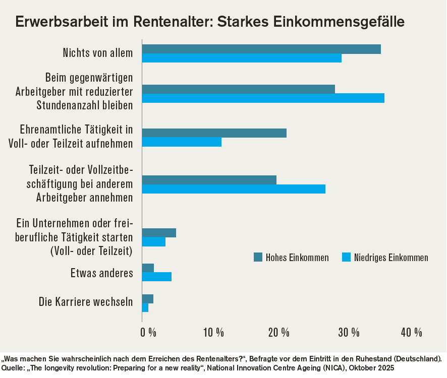 Jenseits des oft zitierten Dachdeckers, dessen Lebensarbeitszeit aus gesundheitlichen Gründen kaum verlängert werden kann, ist längeres Arbeiten nach Erreichen des offiziellen Renteneintrittsalters auch in Deutschland bereits Realität. Rund 65 Prozent der Befragten mit schwächerem Einkommen planen, mit reduzierter Stundenzahl bei ihrem bisherigen Arbeitgeber weiterzuarbeiten oder wollen sich eine neue Anstellung suchen. Wer es sich mit einem höheren bisherigen Einkommen im Rentenalter leisten kann, nicht mehr zu arbeiten, plant dennoch nicht unbedingt, aufzuhören. Auch in dieser Gruppe wollen noch mehr als die Hälfte einer Erwerbsarbeit nachgehen – oder mit einer eigenen Geschäftsidee unternehmerisch neu durchstarten. Nach der Motivation befragt, nennt diese Gruppe eher selten finanzielle Gründe: Sie arbeitet aus sozialen Gründen weiter, um Kontakte zu pflegen (42 %), sie arbeitet, weil die Arbeit für sie Sinn stiftet (29 %) oder Spaß macht (26 %) und um sich geistig und körperlich fit zu halten (23 %). Die Suche nach einer aktiven Rolle mit einer wertvollen und sinnstiftenden Tätigkeit zeigt sich in dieser Gruppe auch in der großen Bedeutung von ehrenamtlicher Tätigkeit (über 20 % der Befragten).