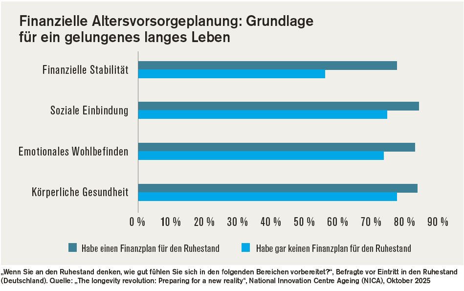 In einer Gesellschaft im strukturellen Wandel kommt der Beratung für die finanzielle Vorsorge damit eine wertvolle und zunehmend tragende Rolle zu. Die Ergebnisse der Studie belegen, dass mehr als die Hälfte der Befragten eine Longevity-Vorsorgeplanungslücke von 10 Jahren oder mehr aufweist. Das bedeutet, dass die Altersersparnisse nach dem Eintritt in den Ruhestand in etwa 10 Jahren oder weniger aufgebraucht sein werden, obwohl die durchschnittliche weitere Lebenserwartung von 65-jährigen Deutschen bei rund 20 Jahren liegt. Und diese Lücke schrumpft nicht etwa nach der Boomer-Generation. Gerade bei der jüngsten Gruppe der Befragten ist sie am größten. Im internationalen Vergleich der aufgebauten Vermögen für das Alter steht Deutschland insgesamt eher schlecht da. In Großbritannien sind es immerhin nur 35 Prozent, bei denen die Rente für 10 Jahre oder nicht mehr ausreicht – die staatliche Förderung von privater Vorsorge macht sich hier bereits bemerkbar. Die Studie stellte auch fest, dass Menschen, die ihr Alter finanziell vorausgeplant haben, auch in den sozialen, emotionalen und gesundheitlichen Werten besser auf die Zeit nach dem Erwerbsleben vorbereitet sind.