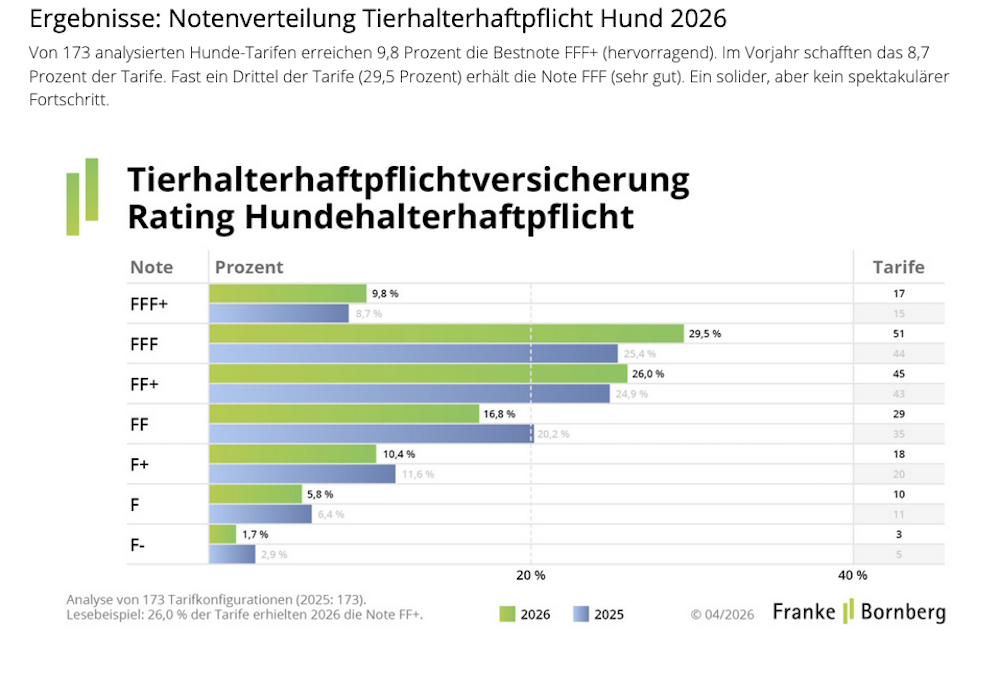 Eine aktuelle Marktanalyse von Franke und Bornberg untersucht 173 Tarife für Hundehalter sowie 136 Tarife für Pferdehalter. Die Zahl der Anbieter ist weiter gestiegen. Im Segment Hund sind inzwischen 88 Versicherer vertreten, im Segment Pferd 76. Trotz dieser Dynamik zeigt sich: Die Qualität der Tarife verbessert sich, aber nur schrittweise.