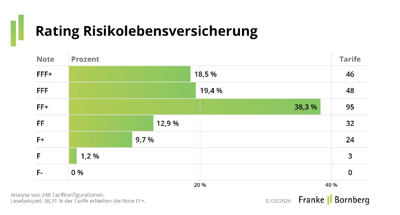 Das Analysehaus Franke und Bornberg (F&B) hat sein Rating für Risikolebensversicherungen überarbeitet und die Bewertungssystematik angepasst. Ziel ist es, Unterschiede zwischen den Tarifen stärker herauszuarbeiten und die Aussagekraft der Bewertung zu erhöhen. Grundlage der Analyse sind 248 Tarifkombinationen von 55 Versicherern.