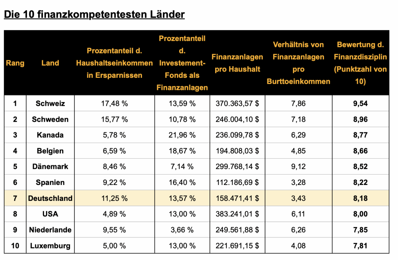 Angeführt wird das Ranking von der Schweiz. Mit einer Bewertung von 9,54 Punkten gelten Schweizer Haushalte als besonders finanzdiszipliniert. Sie sparen 17,48 Prozent ihres Einkommens, was den höchsten Wert aller untersuchten Länder darstellt. Das durchschnittliche Finanzvermögen pro Haushalt beträgt 370.363 US-Dollar und liegt damit knapp unter dem Niveau der USA.