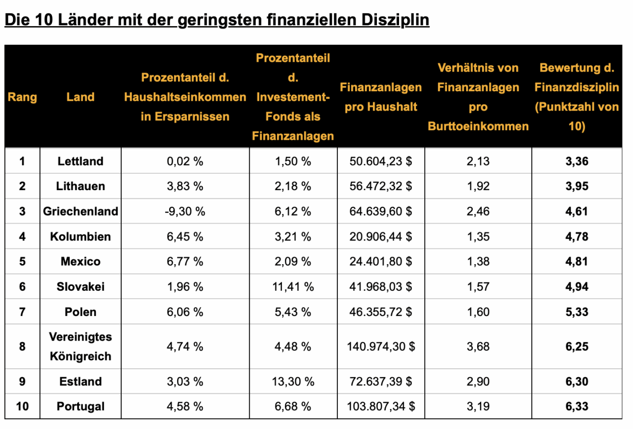 Am unteren Ende des Rankings finden sich vor allem osteuropäische und südamerikanische Staaten. Lettland bildet mit 3,36 Punkten das Schlusslicht. Die Sparquote liegt bei lediglich 0,02 Prozent, während nur 1,50 Prozent des Finanzvermögens investiert werden. In Griechenland ist die Sparquote sogar negativ: Haushalte geben im Schnitt 9,30 Prozent mehr aus, als sie verdienen.