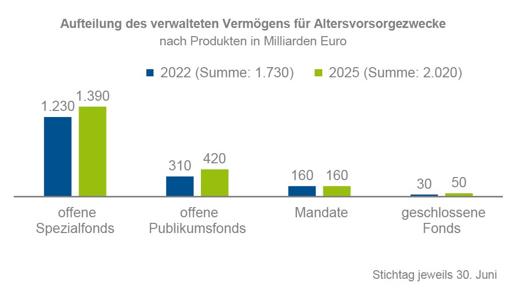 Aus der BVI-Umfrage geht hervor, dass hinter dem für die Altersvorsorge verwalteten Vermögen der Fondsgesellschaften insbesondere die betriebliche Altersvorsorge mit 590 Milliarden Euro, kapitalbildende Lebensversicherungen mit 530 Milliarden Euro sowie berufsständische Versorgungswerke von zum Beispiel Apothekern und Rechtsanwälten mit 520 Milliarden Euro stehen. Zur betrieblichen Altersvorsorge gehören vor allem Direktzusagen (280 Milliarden Euro) und Pensionskassen (180 Milliarden Euro). Auf die Zusatzversorgung der Beschäftigten bei Bund, Ländern und Gemeinden sowie den Kirchen entfallen 180 Milliarden Euro. Im Rahmen von konventionellen und staatlich geförderten Fondssparplänen (Riester- und VL-Fondssparpläne) verwalten die Fondsgesellschaften 190 Milliarden Euro.