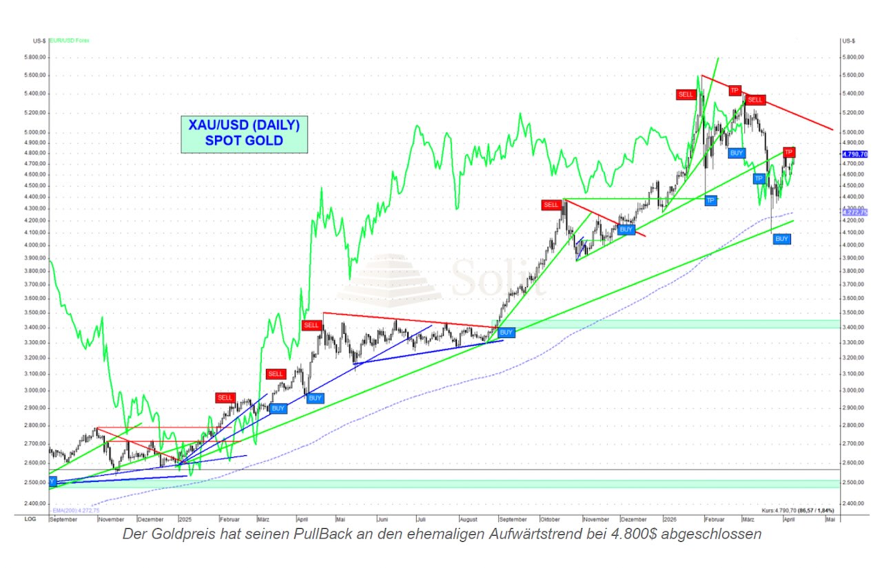In der Folge rechneten wir mit unseren Premium-Abonnenten mit einer Gegenbewegung in Richtung 4.700 bis 4.800 US-Dollar. Diese trat ein und wurde mit dem Waffenstillstand sogar ein zweites Mal angelaufen. Damit hat die erwartete Zwischenerholung grundsätzlich ihr Ende gefunden. Wir haben unsere Gewinne aus dem zwischenzeitlichen Long-Trade vollständig mitgenommen.