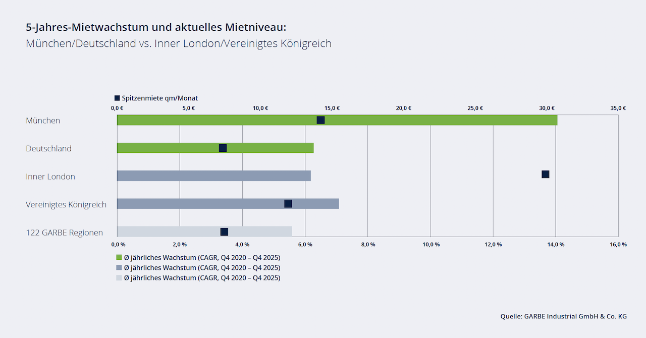 Spanien zählt 2025 zu den relativen Outperformern im europäischen Vergleich. In Barcelona, Madrid und Valencia zogen die Mieten deutlich an, alle drei Regionen gehören zu den zehn dynamischsten Märkten im Garbe-Ranking. In den zentralen Lagen von Madrid und Barcelona trifft eine strukturelle Angebotsknappheit auf anhaltend hohe Nutzer- und Investorennachfrage. Eine geringe spekulative Pipeline verstärkt den Mietdruck zusätzlich. Valencia profitiert zudem von Infrastrukturmaßnahmen wie der Hafenerweiterung.