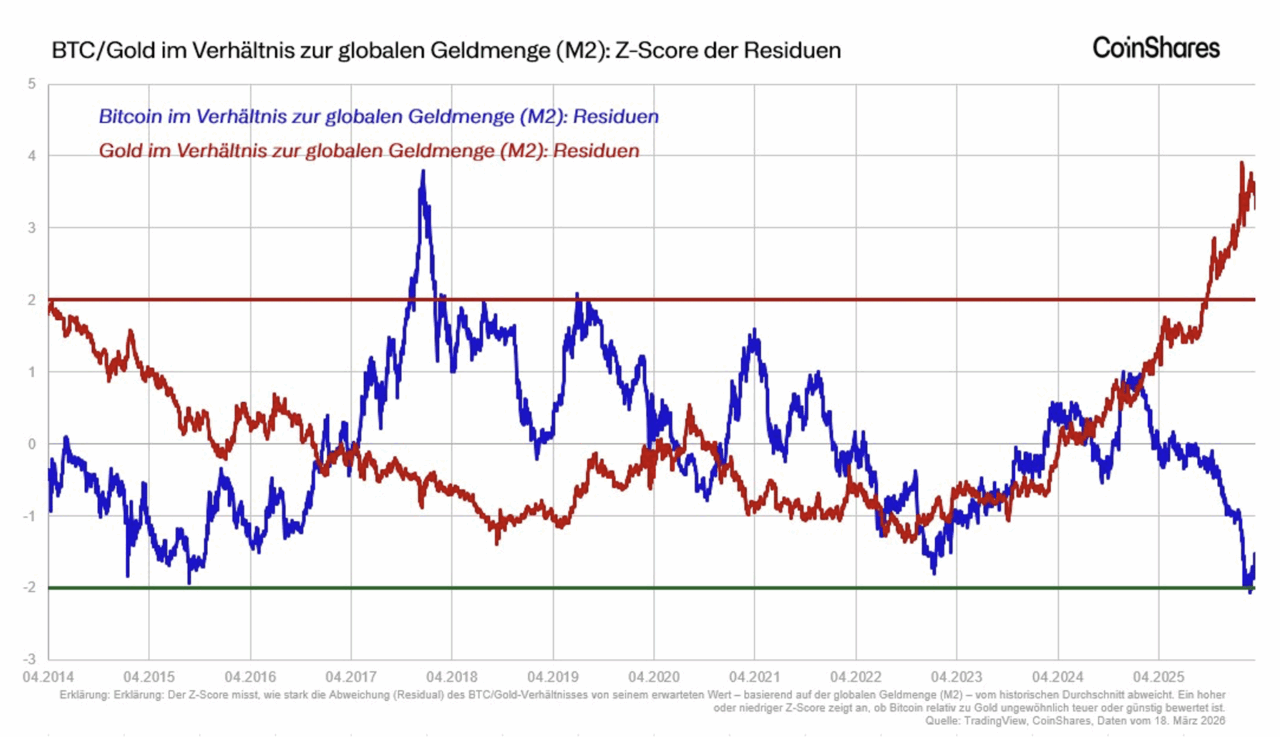 Unsere Analyse zeigt, dass Bitcoin im Verhältnis zur Geldmenge unterbewertet erscheint, während Gold vergleichsweise teuer wirkt. Infolgedessen liegt das Verhältnis von Bitcoin zu Gold derzeit auf historisch niedrigen Niveaus. Die Stärke von Gold lässt sich teilweise durch strukturelle Faktoren erklären. Anhaltende Dollar-Schwäche und steigende geopolitische Spannungen haben Zentralbanken dazu veranlasst, ihre Goldreserven auszubauen. Zudem ist das Verhältnis von Goldbeständen der Zentralbanken zur Staatsverschuldung im historischen Vergleich niedrig, was weiteren Spielraum für Aufstockungen nahelegt. Kurzfristig erscheint das Verhältnis von Bitcoin zu Gold jedoch besonders stark gedrückt im Vergleich zu den globalen Liquiditätsbedingungen. Angesichts der erheblichen Differenz in der Marktkapitalisierung zwischen Gold und Bitcoin könnten bereits moderate Umschichtungen zu deutlichem Aufwärtspotenzial für Bitcoin führen. Diese Entwicklung könnte der Neubewertung im Jahr 2020 ähneln, allerdings ausgehend von einer noch ausgeprägteren Bewertungslücke.