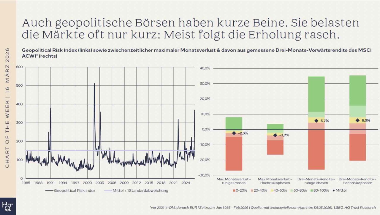 In Monaten mit überdurchschnittlich hohem geopolitischem Risiko verloren Anleger im MSCI ACWI im Schnitt zwischenzeitlich 3,7 %. In ruhigeren Monaten lag dieser maximale Monatsverlust bei durchschnittlich nur 2,3 %. Der Unterschied ist also spürbar – aber vermutlich geringer als viele Anleger befürchten. Drei Monate nach den Hochrisikomonaten notierte der MSCI ACWI durchschnittlich 6 % höher. In normalen Zeiten waren es 5,7 %. Die Erholung nach geopolitischen Schocks fällt damit historisch minimal stärker aus als in ruhigen Phasen.“ In Summe sind die Ergebnisse aber so nah beieinander, dass man sagen kann, dass die Märkte wieder zur Tagesordnung übergegangen sind. Auch an den historischen Schwankungsbreiten sieht man, dass Risiko und Chance rund um geopolitische Spannungen nicht signifikant anders ausfallen.