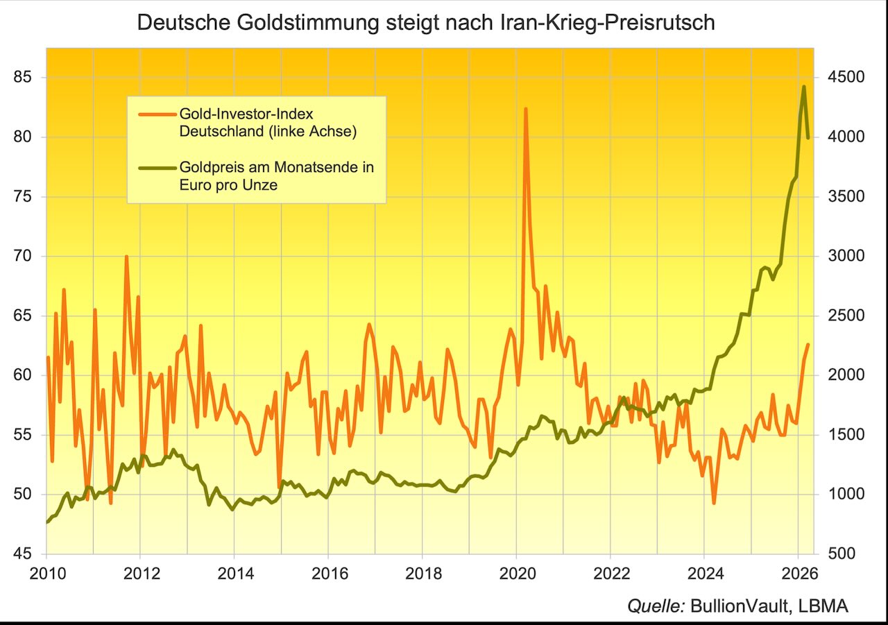 Der stärkste Rückgang des Goldpreises seit 13 Jahren hat im März auf BullionVault zu einer Rekordzahl von Käufen geführt. Auslöser war der Preisrutsch nach dem Kriegseintritt der USA und Israels gegen Iran. Nach neuen Allzeithochs und neun Monaten mit durchgehend steigenden Goldpreisen fiel der Preis in Euro um 9,7 Prozent.