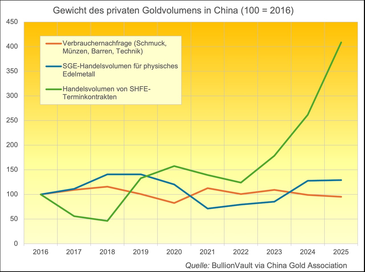 Obwohl sich der Goldpreis in Yuan in den letzten zehn Jahren vervierfacht hat, ist die Goldnachfrage der chinesischen Haushalte sehr konstant geblieben. Gleiches gilt für das Volumen des physischen Goldhandels an der Shanghai Gold Exchange (SGE).