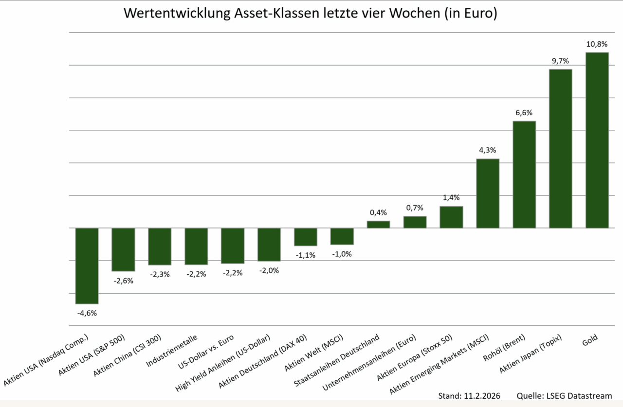 Im Aktienbereich stach insbesondere der japanische Topix hervor, der zuletzt durch den erwarteten und inzwischen mit überwältigender Mehrheit erfolgten Wahlsieg von Premierministerin Takaichi beflügelt wurde. Aber auch Schwellenländeraktien konnten deutlich zulegen und europäische Werte zumindest ein kleines Plus erzielen, während amerikanische Titel am anderen Ende der Performance-Skala zu finden sind.