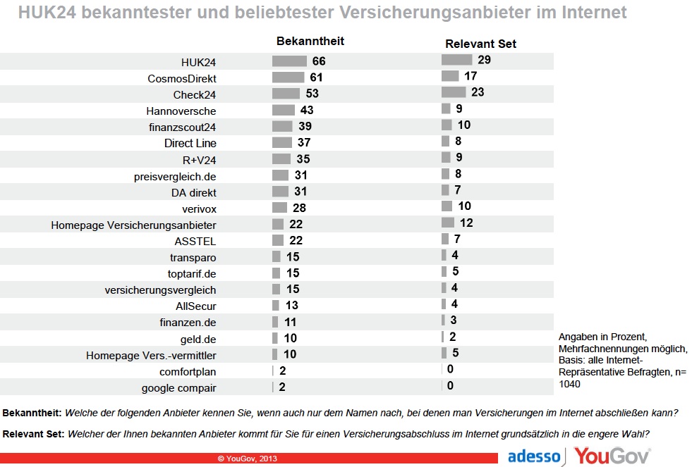 Zwei Drittel der Internetnutzer kennen die Huk 24. Zudem ziehen 29 Prozent die Direktversicherungstochter der Huk-Coburg für einen möglichen Versicherungsabschluss im Internet in die engere Wahl (siehe Grafik). Damit führt das Unternehmen das Ranking der bekanntesten und beliebtesten Online-Versicherer an. Nur Cosmos Direkt (17 Prozent), Hannoversche und R+V 24 (jeweils neun Prozent) erreichen unter den Direktanbietern ähnliche Beliebtheitswerte wie die Huk 24. Das Ranking wurde durch das Marktforschungsinstitut You Gov und dem IT-Dienstleister Adesso im Rahmen der Studie „Inter@ction Assekuranz“ erhoben.