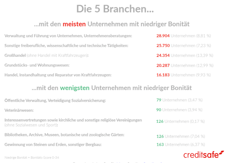 Die deutschen Wirtschaftszweige sind sehr unterschiedlich auf die Corona-Krise vorbereitet – dies zeigt eine Analyse von Creditsafe Deutschland. Die weltweit meistgenutzte Auskunftei hat dazu die Bonität der rund drei Millionen deutschen Unternehmen ausgewertet. Die Ergebnisse der Auswertung.