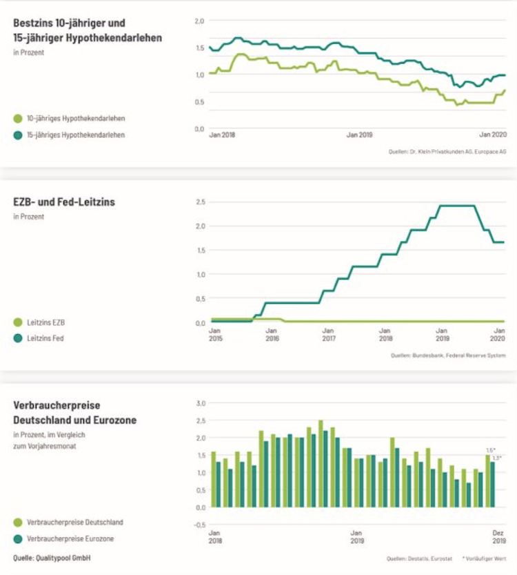 „Nach deutlicheren Anstiegen im November haben sich die Finanzierungszinsen im Dezember kaum weiterbewegt. Das ist keine Überraschung und hauptsächlich auf die Feiertagspause zurückzuführen. Darüber hinaus scheint die Fed ihr Feld für 2020 bereits bestellt zu haben. Wenn es so bleibt, sind von der US-Notenbank kaum Impulse zu erwarten. Vielmehr hat es den Anschein, dass die EZB – im Rahmen ihrer limitierten Möglichkeiten – unter Christine Lagarde in diesem Jahr für geldpolitische Überraschungen sorgen könnte. Die Erfahrung der letzten Jahre zeigt aber auch, dass neue Risikofaktoren, z. B. geopolitische Konflikte, schlagartig auftreten können und die Ausgangslage für die Notenbanken in Windeseile verändern. Aktuell rechnen wir für die kommenden Monate mit anhaltend sehr niedrigen Baufinanzierungszinsen. Zusätzlich dazu schaffen unsere Produktpartner mit Sonderaktionen und einer Erweiterung des Angebots, etwa mit langen Zinsbindungen, attraktive Impulse für Finanzierungskunden.“